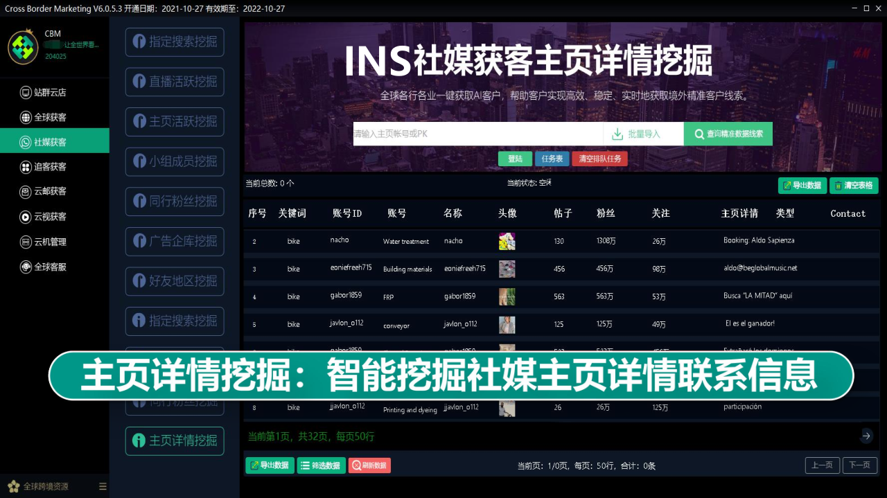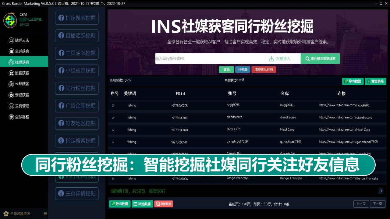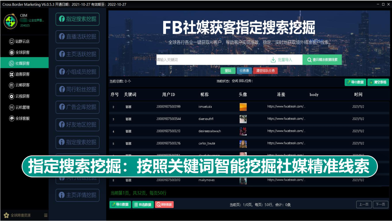 全球活跃挖掘LBS活跃挖掘YP活跃挖掘指定搜索挖掘同行粉丝挖掘小组活跃挖掘主页活跃挖掘小组成员挖掘 直播活跃挖掘好友地区挖掘广告企库挖掘指定搜索挖掘贴文关注挖掘同行粉丝挖掘主页详情挖掘